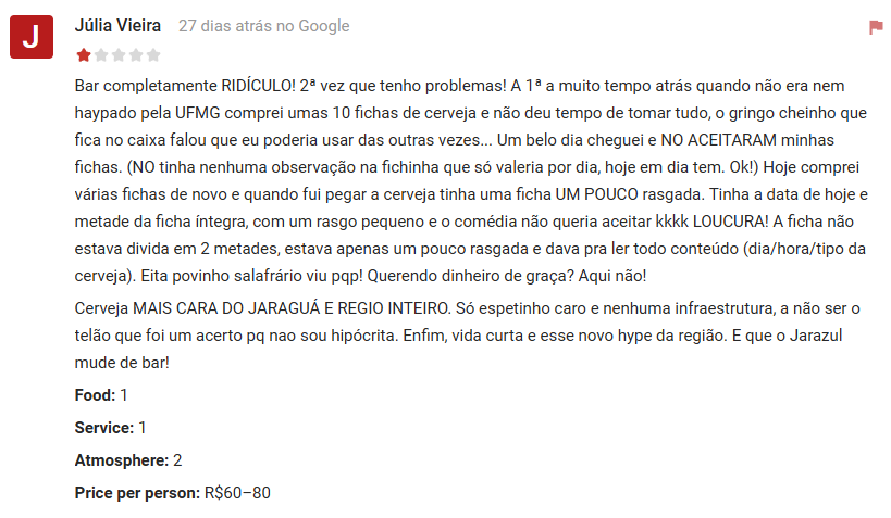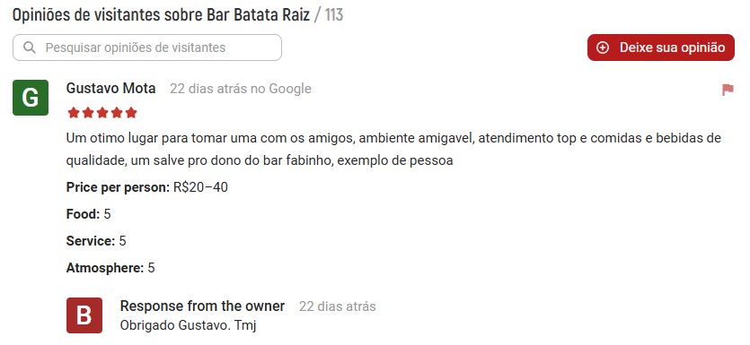 Nas avaliações deixadas no Google, a experiência continua variada: há quem ame e quem odeie a experiência no Bar Batata Raiz.