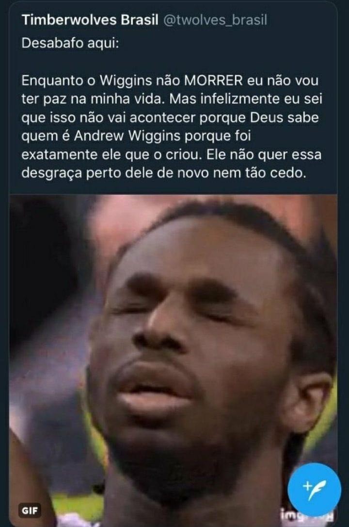 Andrew Wiggins foi a primeira escolha geral do draft de 2014 da NBA, chegando ao time Minnesota Timberwolves com grandes expectativas. Entretanto, o atleta não correspondeu às esperanças da torcida, vivendo altos e baixos na equipe, o que motivou a página Timberwolves Brasil a fazer o tweet abaixo: